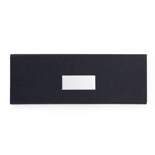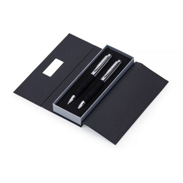 Conjunto caneta e lapiseira em estojo de cartonagem com placa central para personalização. Caneta/Lapiseira metal prata com detalhes diferenciados na parte inferior, clip metal com detalhe de linha no centro. Acionam por giro. Estojo revestido com espuma na parte interna.