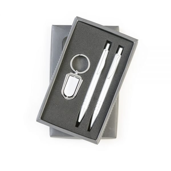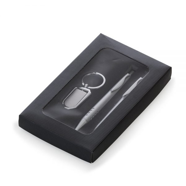 Caneta e lapiseira com detalhes em prata com furos na parte inferior, para um melhor apoio, chaveiro na cor prata giratório.Estojo em papelão cores em degrade preto e cinza resistente, Com tampa plástico, Caneta e lapiseira acionam por clique.