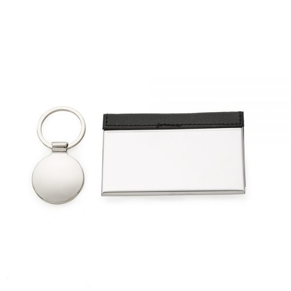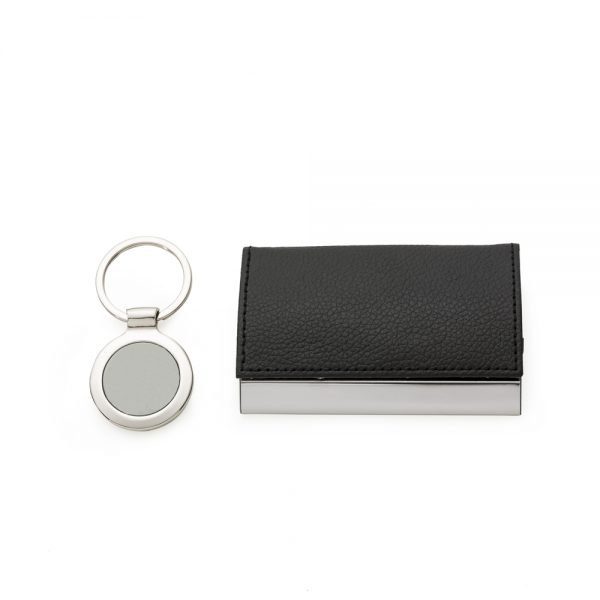 Kit porta cartão e chaveiro metal. Embalagem de papelão com parte interna de veludo, porta cartão em couro sintético com detalhe em metal e parte interna em veludo. Chaveiro redondo de metal com chapa fumê(verso liso).