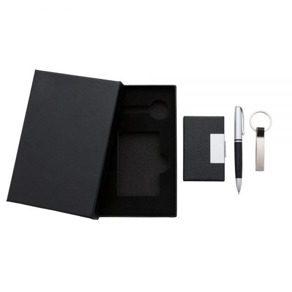 Kit executivo 3 peças em estojo de papelão com tampa e parte interna revestida de espuma. Contém: chaveiro metal fosco com detalhe emborrachado preto, porta cartão de couro sintético(verso metálico liso) com placa de metal e caneta metal fosca com detalhe emborrachado preto.