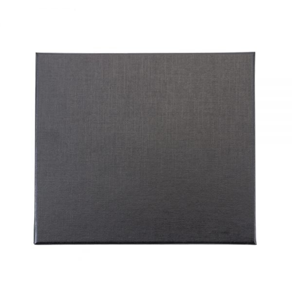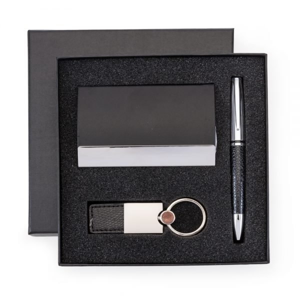 Kit executivo 3 peças em estojo de papelão com tampa e parte interna revestida de espuma. Contém: porta cartão de couro sintético texturizado com detalhes prata brilhante, caneta metal fosca com detalhe emborrachado preto, caderneta tipo moleskine em couro sintético com aproximadamente 80 folhas amarelas pautadas. Acompanha placa metálica para gravação.